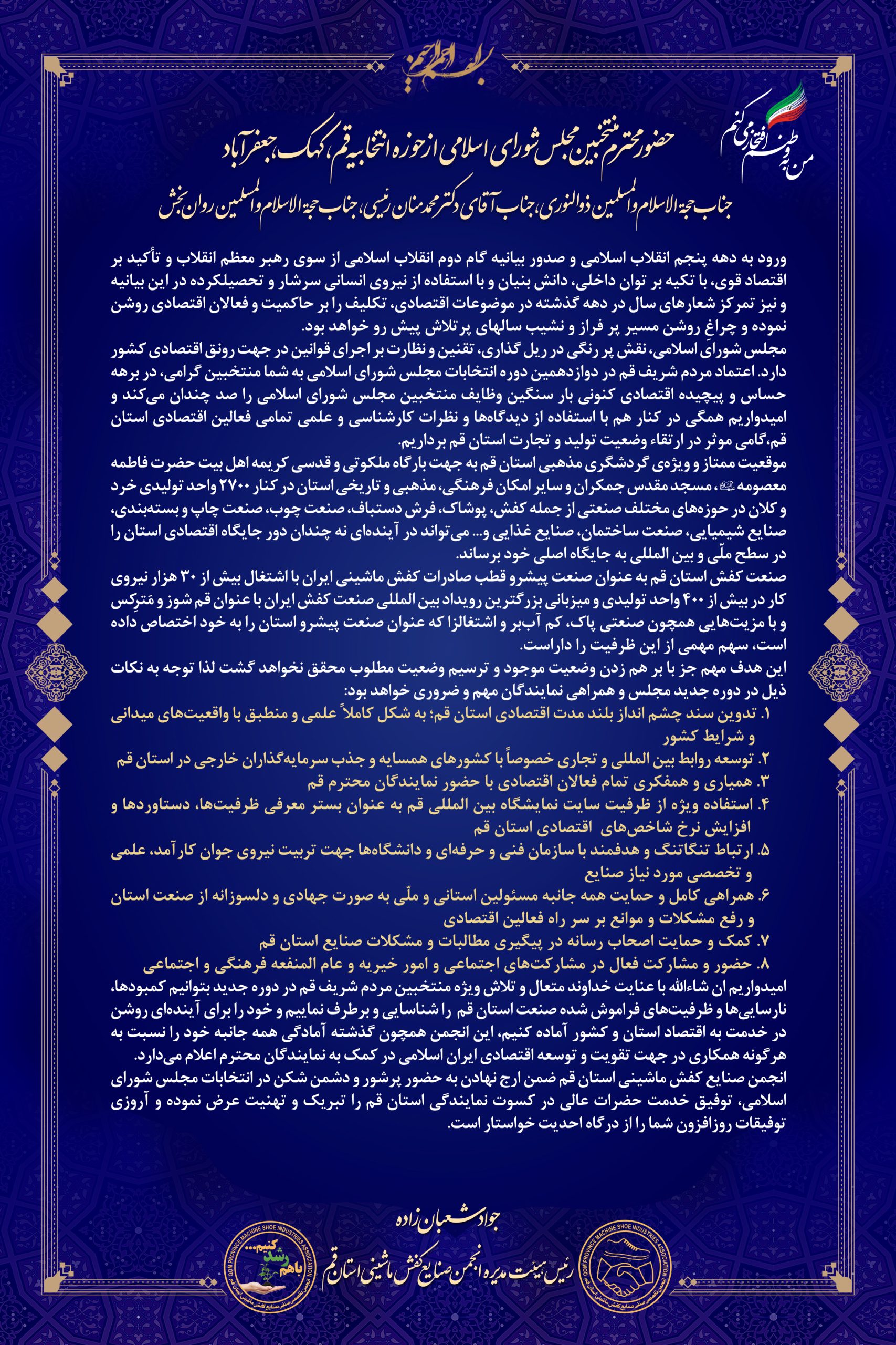 ۸٫ حضور و مشارکت فعال در مشارکتهای اجتماعی و امور خیریه و عام المنفعه فرهنگی و اجتماعی امیدواریم ان شاءالله با عنایت خداوند متعال و تلاش ویژه منتخبین مردم شریف قم در دوره جدید بتوانیم کمبودها، نارساییها و ظرفیتهای فراموش شده صنعت استان قم را شناسایی و برطرف نماییم و خود را برای آیندهای روشن در خدمت به اقتصاد استان و کشور آماده کنیم، این انجمن همچون گذشته آمادگی همه جانبه خود را نسبت به هرگونه همکاری در جهت تقویت و توسعه اقتصادی ایران اسلامی در کمک به نمایندگان محترم اعلام میدارد.