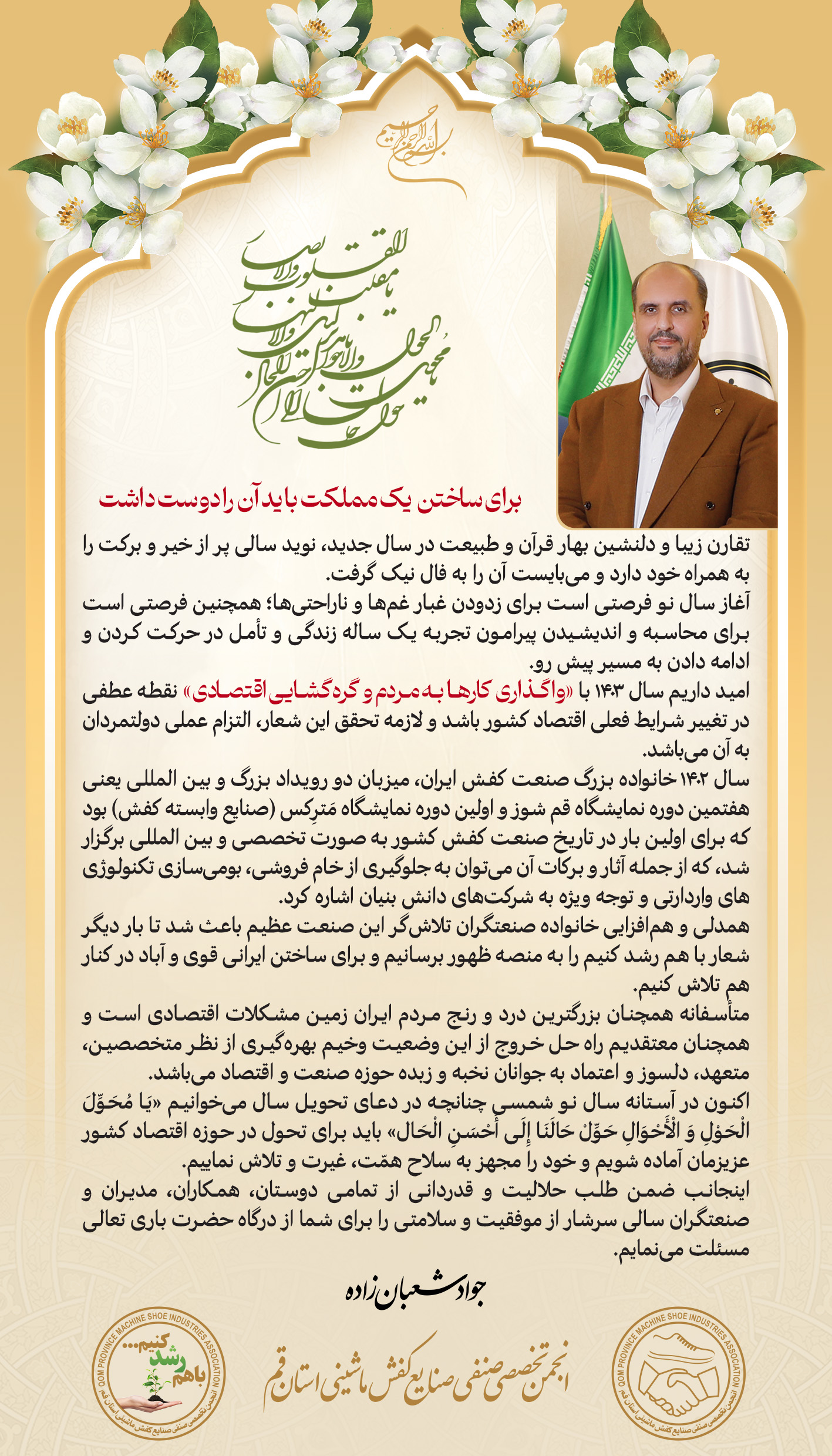 اینجانب ضمن طلب حلالیت و قدردانی از تمامی دوستان، همکاران، مدیران و صنعتگران سالی سرشار از موفقیت و سلامتی را برای شما از درگاه حضرت باری تعالی مسئلت مینمایم.