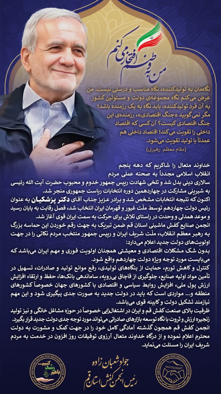 انجمن صنایع کفش ماشینی استان قم ضمن تبریک به جهت رقم خوردن این حماسه بزرگ به رهبر معظم انقلاب، ملت شریف ایران و رئیس جمهور منتخب مردم نکاتی را در جهت اولویتهای دولت جدید اعلام میدارد: